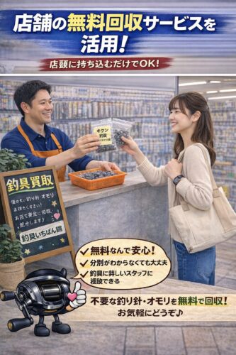当店(釣具いちばん館 全店)では、不要になった釣り針・オモリを無料で回収しています。