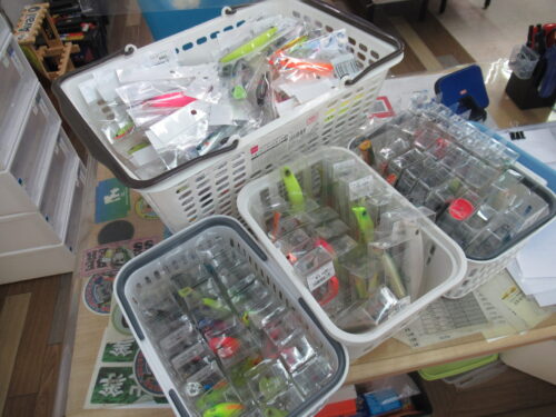 アイマ、DUO、ポジドライブガレージ、ブルーブルー、メガバスなどのシーバスルアーを大量に店頭陳列しました。