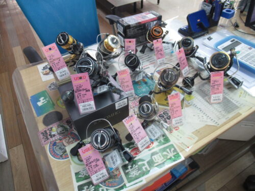 シマノ、ダイワ、アブガルシアのスピニングリールを店頭陳列しました。